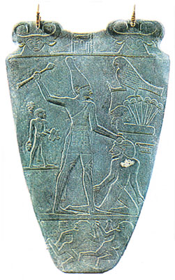 Obrázok vľavo: Paleta kráľa Meniho. Faraón má na hlave bielu tiaru, znak Horného Egypta. Za faraónom kráča jeho nosič sandálov, oproti nemu sokol odratúva šesť kolíkov, čiže 6000 zabitých nepriateľov.