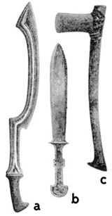 Obrázok vľavo: Egyptské bronzové zbrane z doby "Strednej ríše" - meč (alebo mačeta - a), dýka (b) a sekera (c)